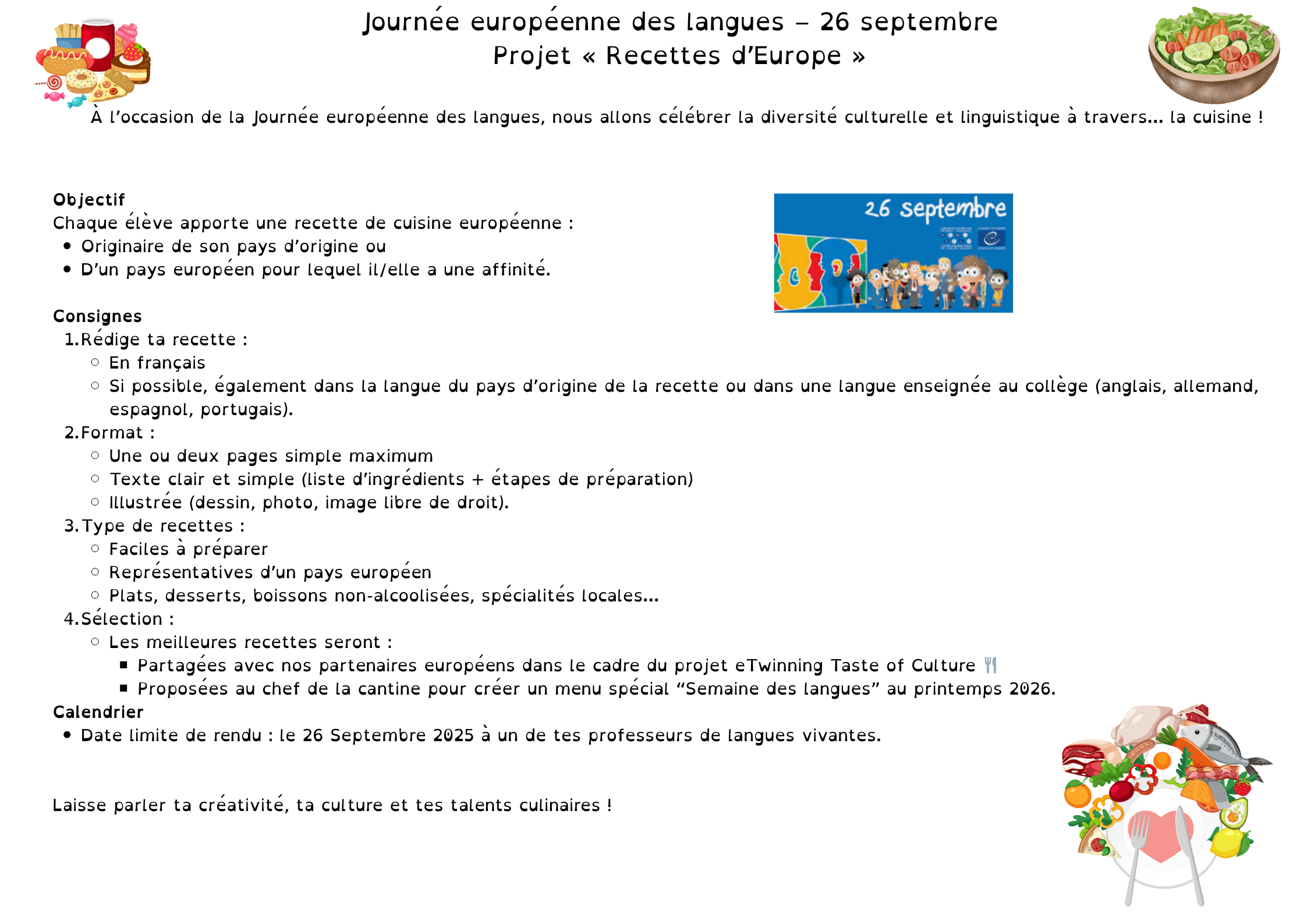 - Janvier : rédaction et partage d’un livre de recettes européen illustré.